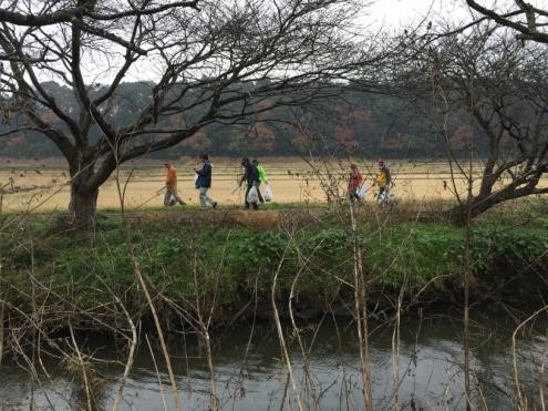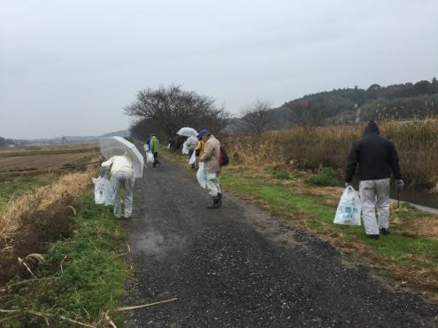 昨年同様、白井市役所に集合し、白井市のマクロバスと美手連でレンタルしたマクロバス2台に分乗し現地に向い、効率よく作業に取りかかることができました。二手に分かれて、名内橋と今井三号橋からそれぞれゴミを拾い、合流後は近くの今井青年館に移動し作業終了です。
