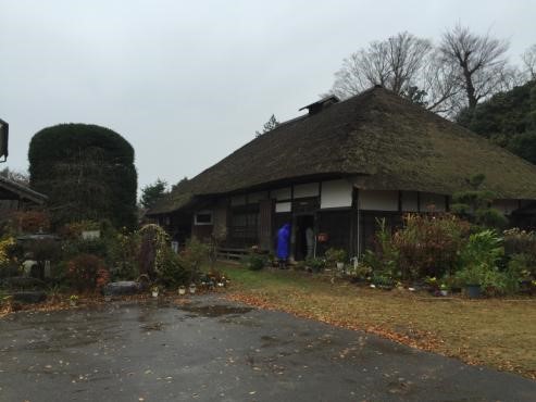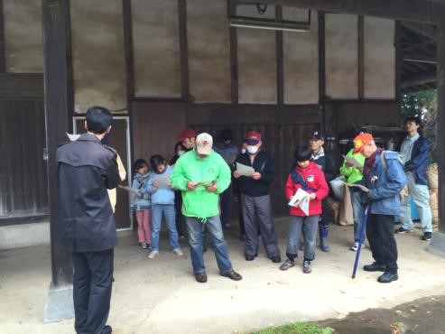 その後、手賀沼流域の平塚地区にある国指定重要文化財の「滝田家住宅」を滝田家ご当主と白井市文化課職員さんに案内していただき見学しました。滝田家は江戸時代以来平塚地区の船戸に住む旧家で、手賀沼の水運にも縁の深い、当地でも有力な農家です。およそ350年間住み続けている大きな傾斜のある茅葺の屋根は、雨水がしみ込む前に表面を流れ落ちるように作られているそうで、折しも降りやまない雨が説明に一役買っていました。