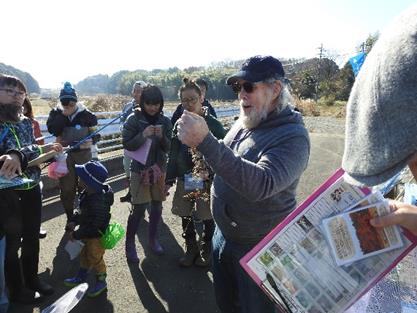 当日は好天に恵まれ、印西中学校に集合後、亀成川古新田橋から右岸と左岸に分かれて上流へ移動しました。当会会員が胴長を着て川の中や法面のゴミを引きあげます。亀成川と古新田川の合流部では、講師のケビン・ショートがお待ちかねです。ゴミ拾いはここでおしまい。これから待望の観察会です。「生きものみっけシート」を手に、虫取り網でとった昆虫など見つけた生きものをチェックしていきます。また、ケビンさんが用意してくれたビニール袋に思い思いに木の実などを採取します。集合場所に戻り、みっけシートをみんなでチェックし直しました。全部で47種の生きものを確認したところで、ケビンさんが「ヒト」を忘れているよ。全部で48種でした。