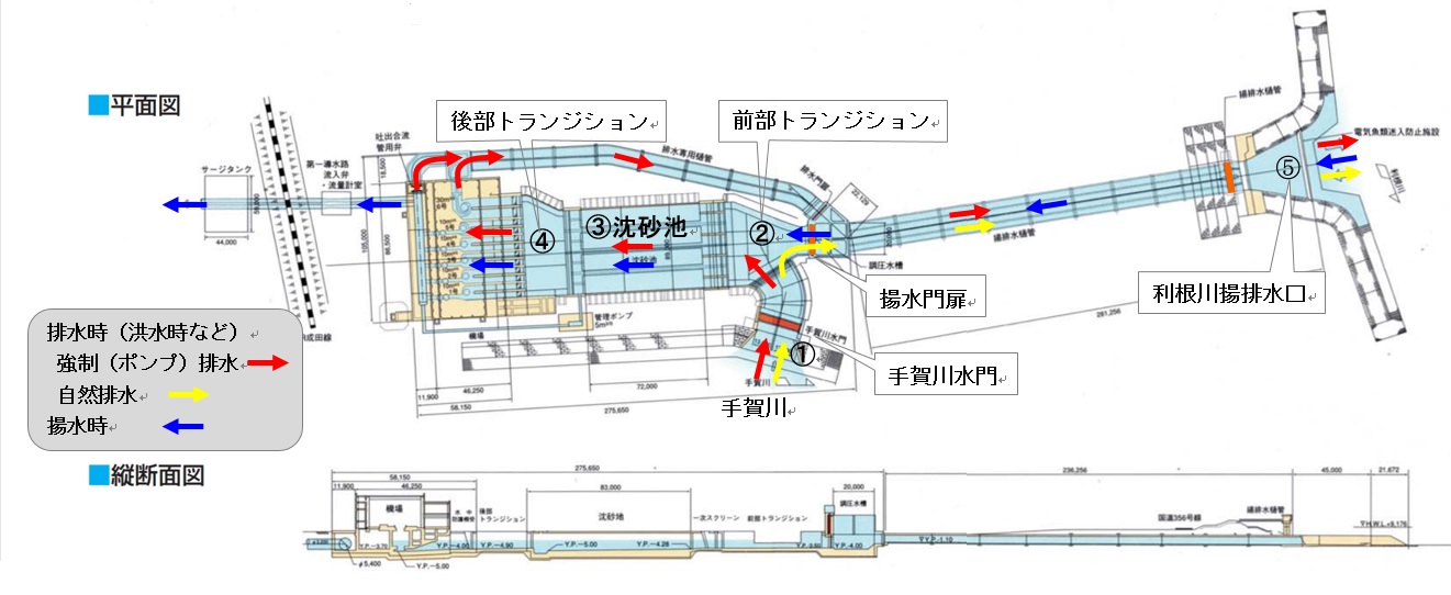 手賀沼の水位が基準値より高くなると、①手賀川水門と②揚水門扉を開け、⑤利根川に自然排水されます。そして、大雨により利根川の水位が高くなれば、①手賀川水門、②前部トランジション、③沈砂池、④後部トランジションを通り、ポンプで排水樋管へ送り出され、⑤利根川に強制排水されます。
