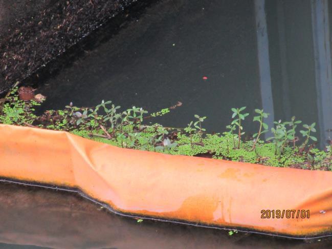 ①水門前には、浮きのついたネットが張られていますが、ナガエが絡みついています。③沈砂池前にはレーキ形除塵機が設置されておりますが、数センチ幅のスクリーンでは、簡単に切れ端は通り抜けられます。そのスクリーンの前にもナガエが繁茂していました。④ポンプのある機場前に設置されたスクリーンの前方には、オイルフェンスが張られていますが、そこにもナガエが生えていました。また、利根川揚排水口にある電気魚類迷入防止施設の両端にはナガエの群落が複数できていました。