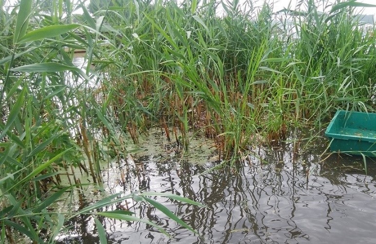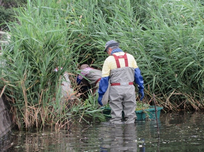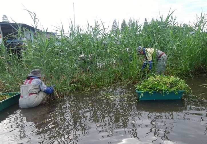 体力を考慮し、酷暑の日中を避け、早朝6時半から作業を開始しました。前回と同様に、胴長を着用し、ナガエツルノゲイトウ・オオバナミズキンバイを引き抜き、田舟に積み込み、陸揚げしました。今回は、最初から土嚢袋より大きいガラ袋に詰め込み、作業はスムーズに完了。