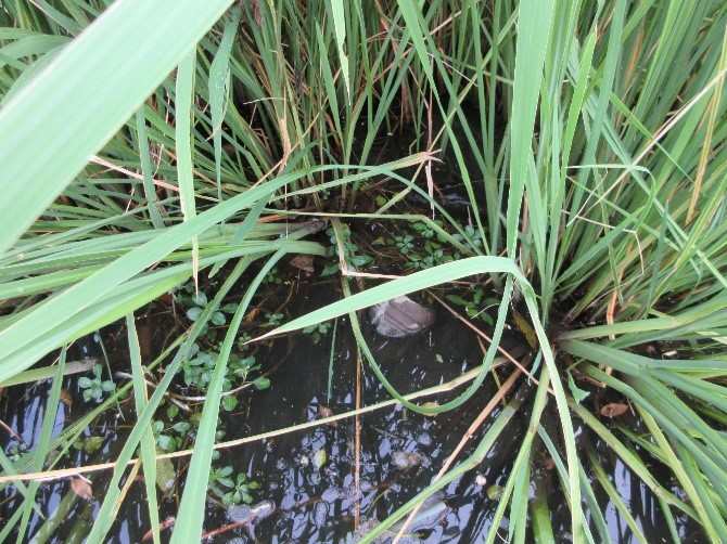 6月22日に登録ボランティアさんと駆除した手賀沼公園駐車場地先のナガエツルノゲイトウ・オオバナミズキンバイが、7月25日の定点観察時には、再び発芽しているのが見受けられました。間もなく手賀沼土地改良区の用水供給が終了し、水位が下がります。根づいてしまうとまた厄介なことになります。前回の経験から、水位の高いこの時期に駆除すれば作業は楽であり、今なら量的にも大したことはないだろうと決行しました。