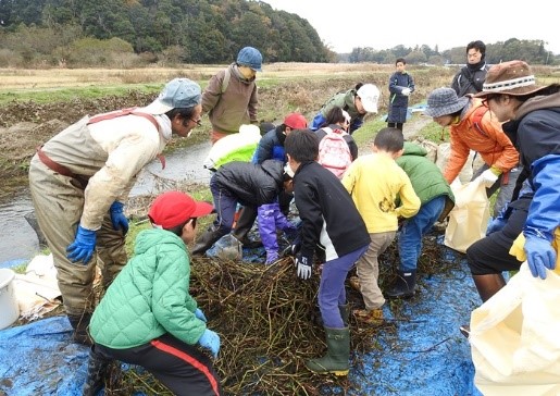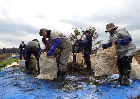 印西中学校に集合後、駆除現場まで2班に分かれてゴミ拾いをしながら移動します。家族参加の皆さんは広範囲にわたりゴミ拾いし、ゴミ拾い終了後、駆除現場でナガエツルノゲイトウに紛れて引き揚げられ水生生物を救出しました。ナガエツルノゲイトウ駆除班には、3名の東邦大学生が今年も戦力となってくださり、ナガエツルノゲイトウの詰まったガラ袋が次々とトラックに積みこまれました。昨年の土嚢袋と違い間口が広く容量の大きいガラ袋で作業効率はアップ。それらを環境保全課の職員さんがトラックで仮置き場に運搬し、乾燥後焼却処分をしてくださいました。