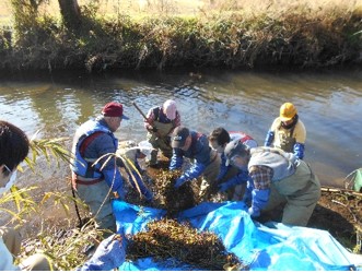 今年は、一般参加者が非常に少なかったが、多くの白井市内の市民活動団体の皆さんが参加してくださいました。例年同様、白井市役所に集合し、白井市と美手連がレンタルしたマイクロバスの2台に分乗し、現地に移動しました。作業はゴミ拾いに加え、今年は、ナガエツルノゲイトウ駆除が加わりました。名内橋から今井三号橋へ向いゴミ拾いを担当したのは、一般の方と六見会、隊友会の皆さんです。一方、ナガエツルノゲイトウ駆除は、下手賀沼にはかなり繁茂しているナガエツルノゲイトウですが、名内橋から下流の金山落にはさほどではなく、より上流にある今井橋と三号橋間のポンプ場下流側の群落を駆除しました。NPO法人しろい環境塾の協力を得て、事前にスムーズな作業の流れを提案していただいたおかげで、時間内にすべての作業を終えることができました。川岸から張り出したナガエツルノゲイトウの群落は、切り離すと簡単に移動することができ、小分けにして引き上げ、待ち構えていた桜台児童館の子どもたち8人と先生がガラ袋に詰める。作業終盤、川岸の陸生化したナガエツルノゲイトウの引き抜きには大変苦労しました。約1時間の作業でしたが、見事な連携プレーでした。引き上げたナガエツルノゲイトウに紛れていた水生生物も救助しました。(タモロコ、タイリクバラタナゴ、スジエビ、テナガエビ、ガガンボ幼虫)