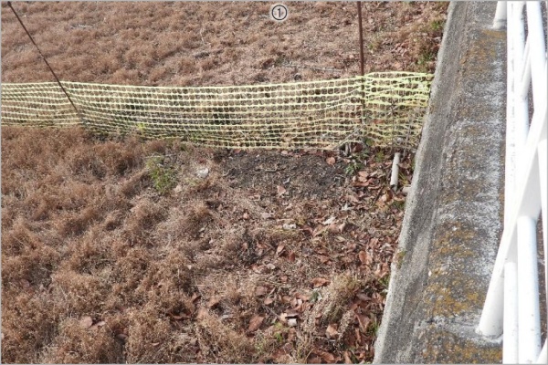 地点①のネット前(東側)は草で覆われていたが、護岸脇でオオバナの成長の兆しが見られた。