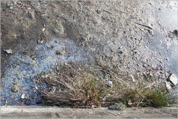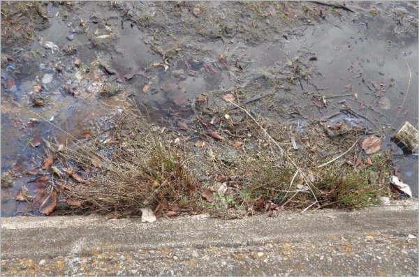 イグサと地点③の中間地点で前月発芽が見られた箇所のオオバナは、排水口の前の水路を埋めつくすように新芽を伸ばしていた。