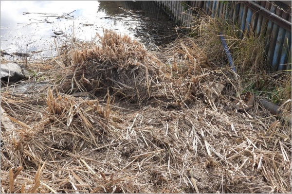 ボート乗り場付近では、床の前にヨシなどの枯れ枝が置いてあったが、ナガエ等が床の下に侵入するのを防ぐためだそうだ。この日(6月21日)も強い南風によって打ち寄せられていた。 ここにはナガエ・オオバナはなかった。