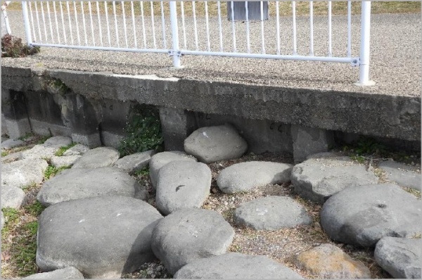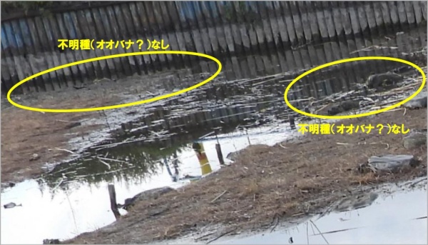 地点①のネット前(東側)の護岸脇の草に隠れていたオオバナは除去作業によってなくなっていた。