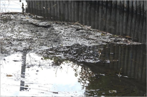 地点① ネットの西側は水位の上昇と共に枯れた植物片が大量にネットに沢山集まっていた。人為的に刈られた細長い緑の葉が大量にあった。ナガエ・オオバナはなかった。