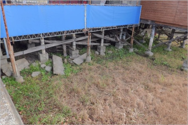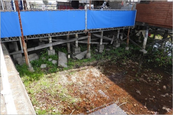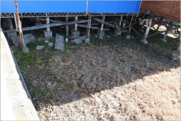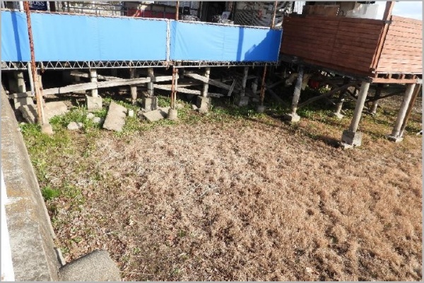 ボート乗り場付近の建物の前面は、小さな植物片が打ち寄せられていたがナガエ・オオバナは無かった。奥の床下にナガエ?