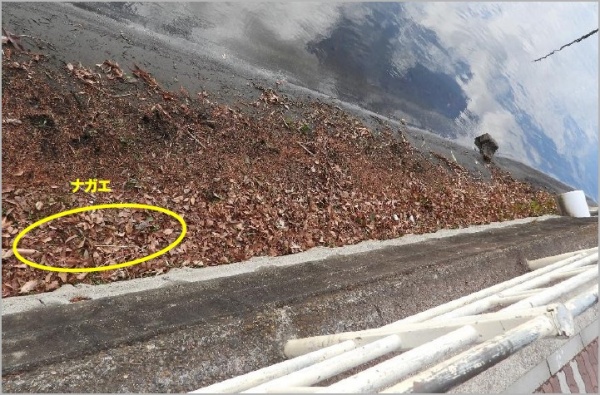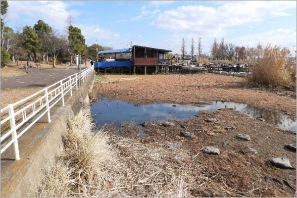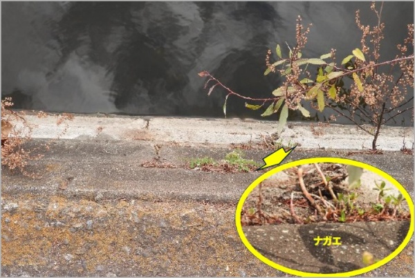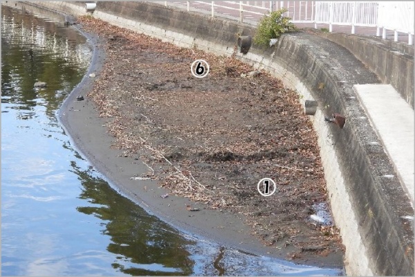 観察日に行われたナガエ・オオバナの駆除作業により、水面を見た範囲ではナガエ等は見当たらなかった。観察当日は強い南風によって枯れ葉等が護岸に打ち付けられていた。