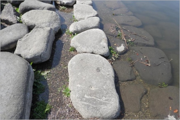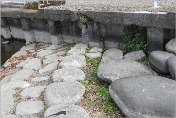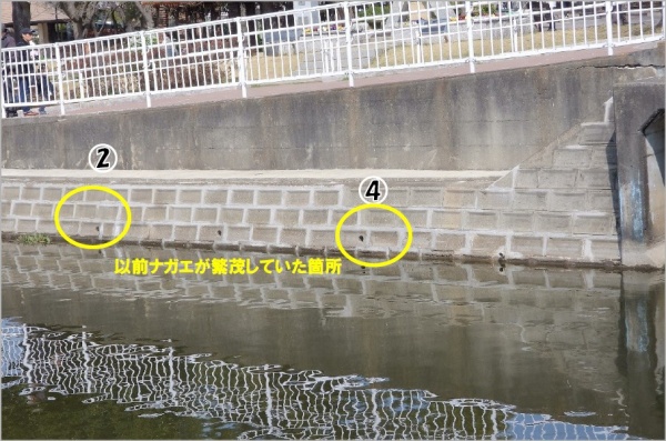 中央公民館よりの護岸には、2つあったナガエの群落のひとつ(手前側)が消滅している。新たに奥に小さな群落ができている。