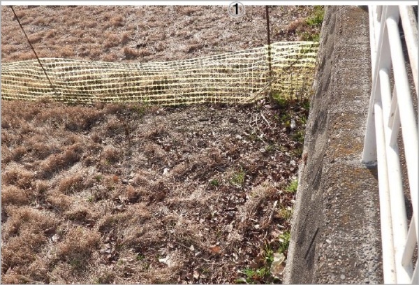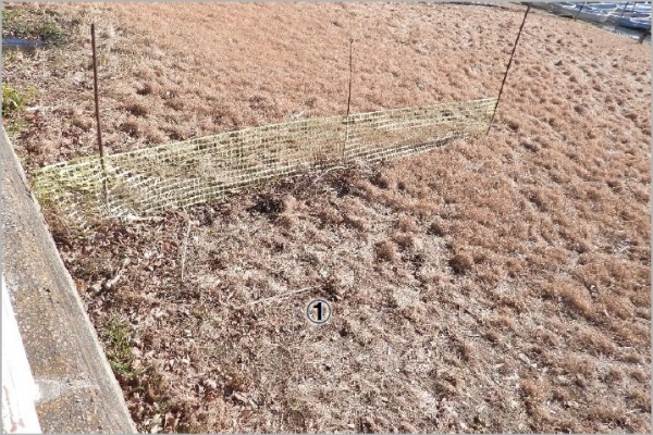 地点① ネットの西側の草は黄土色美味に変色していたが、護岸の緑色の草の中にオオバナが発芽していた。ネットの隣(東側)のオオバナと並んだ形での発芽であった。