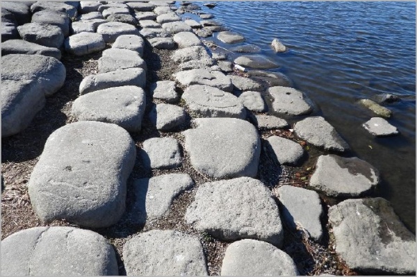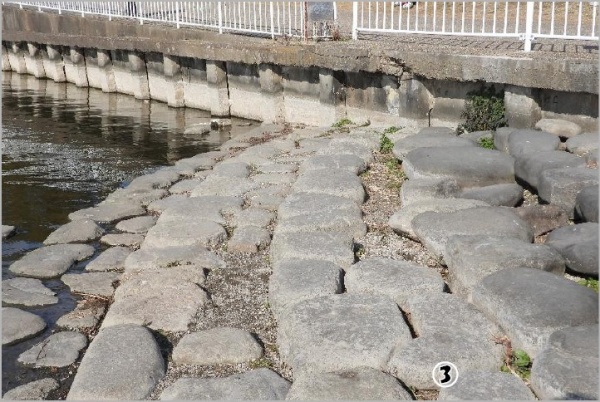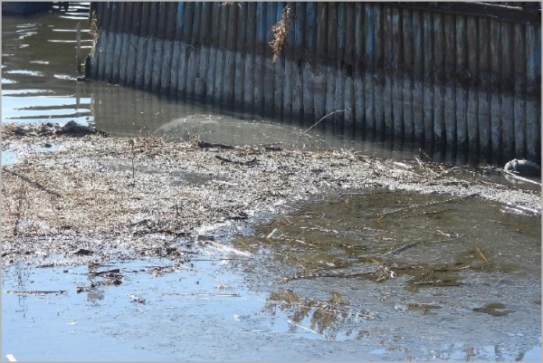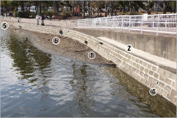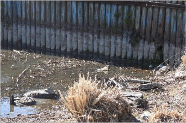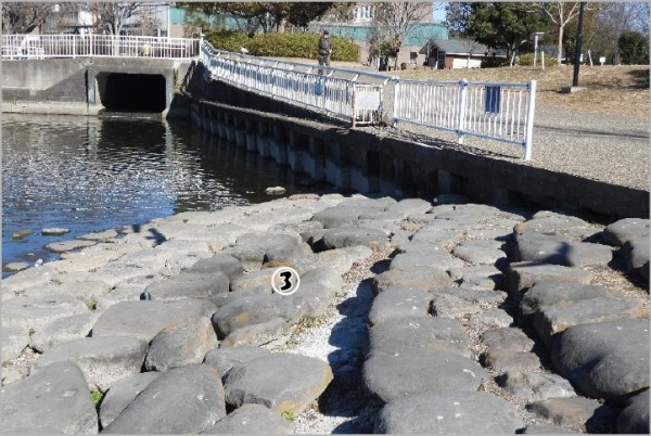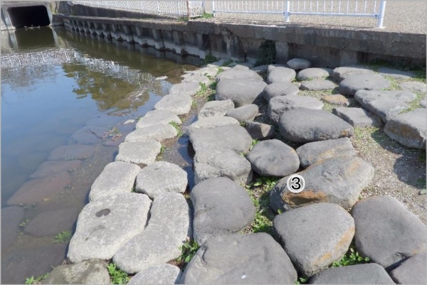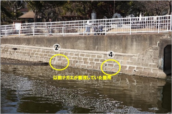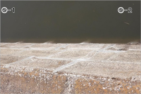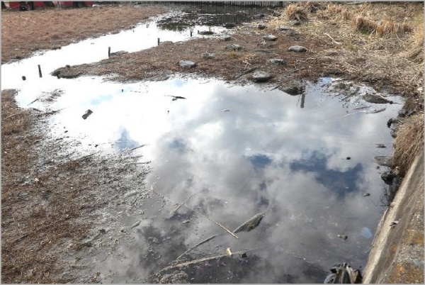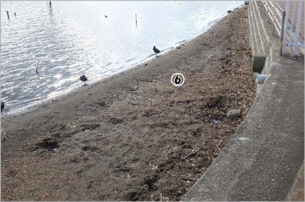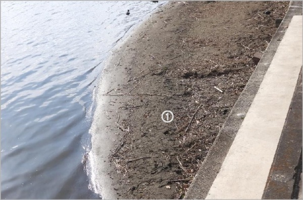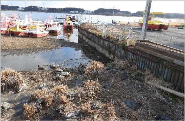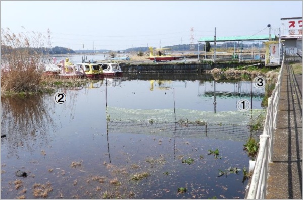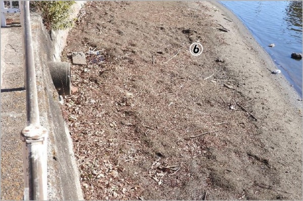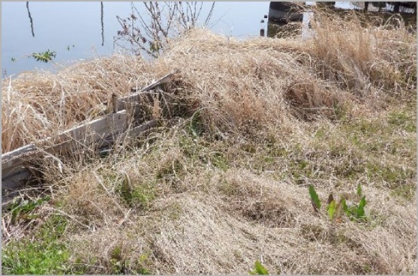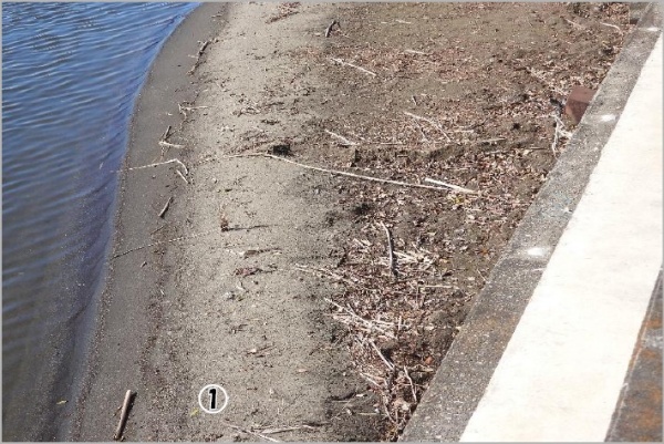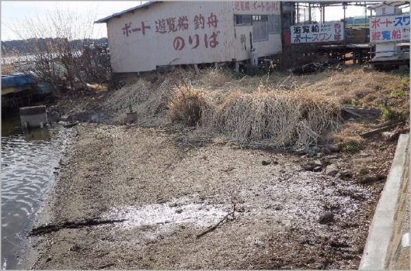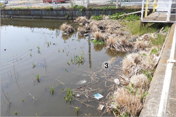 地点③は水で覆われ枯れた植物の茎が多数護岸近くに押し寄せていた。水面には草が成長し始めていたがナガエ、オオバナは無かった。