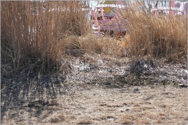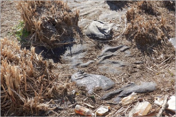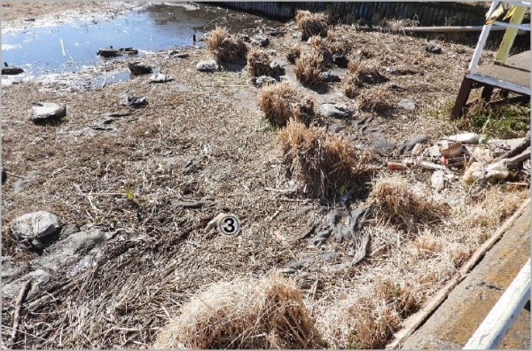 地点③:枯れたマコモは前月より刈り取られ遮光シートが見えていた。マコモ域の中心部にはナガエは見当たらなかった。