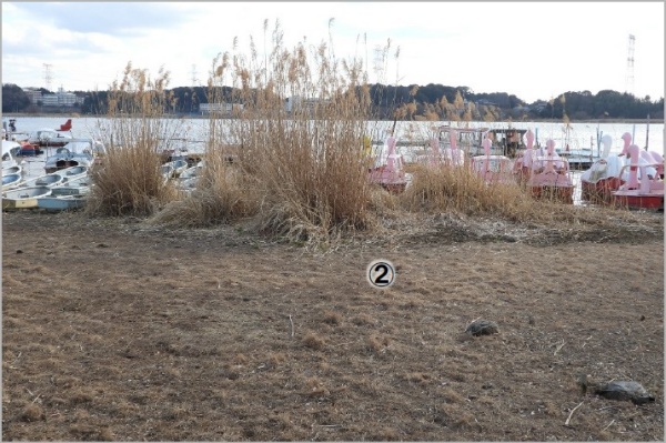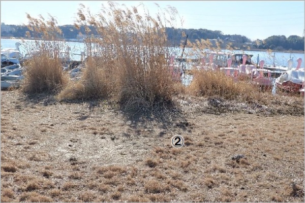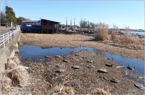 別の角度から見た地点②:マコモとヨシは枯れていた。マコモとヨシの前のナガエは見当たらなかった。