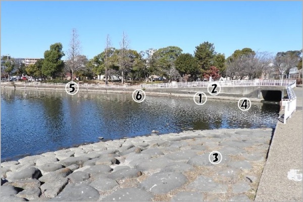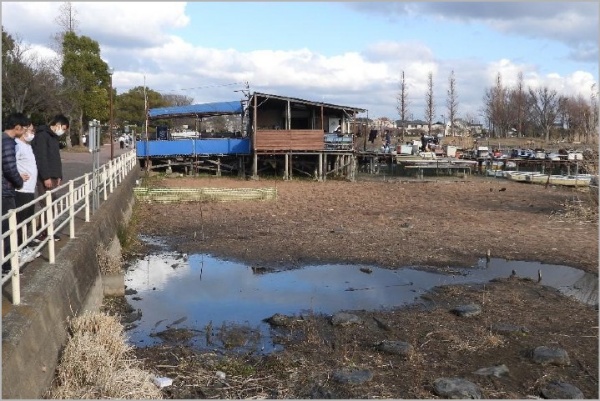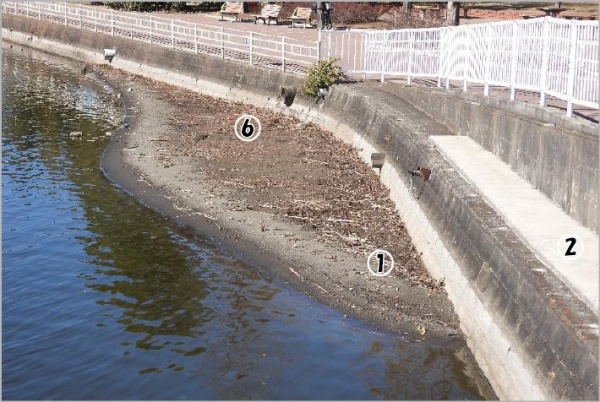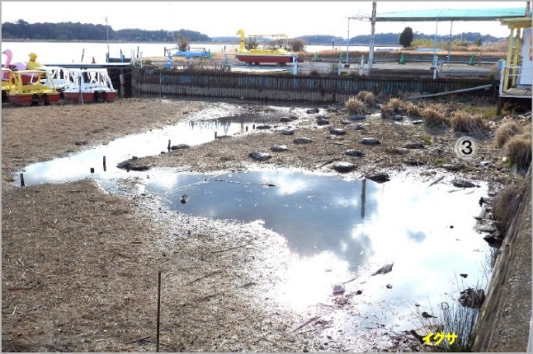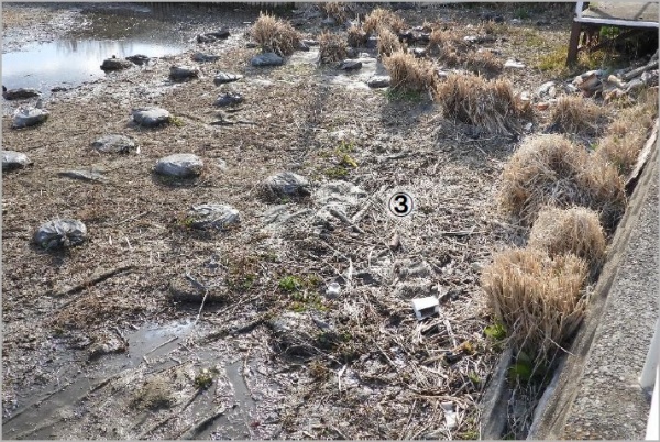 地点③:マコモは枯れかなりの部分は更に刈り取られ、散らばっていた葉も取り除かれていた。マコモの際付近にあったナガエは除去され今月も見当たらなかった。