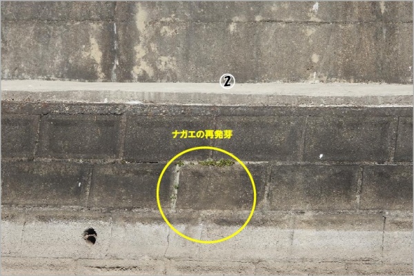 地点③奥のマコモの中心部のナガエは見えなかったが、自動販売機脇のナガエは大半は除去されていたが一部茎が残っていた。