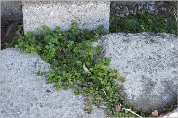 自動販売機裏の干潟では色々な植物は芽吹いていた。ナガエ・オオバナは無かった。