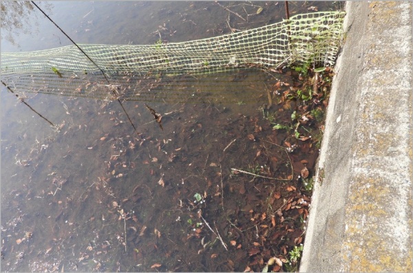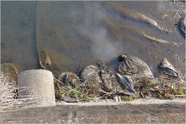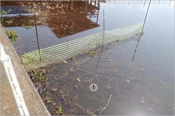 ネットの西側は水位が上昇し沢山の植物の茎が集まっていた。護岸脇に草が生えていたが、ナガエは見当たらなかった。