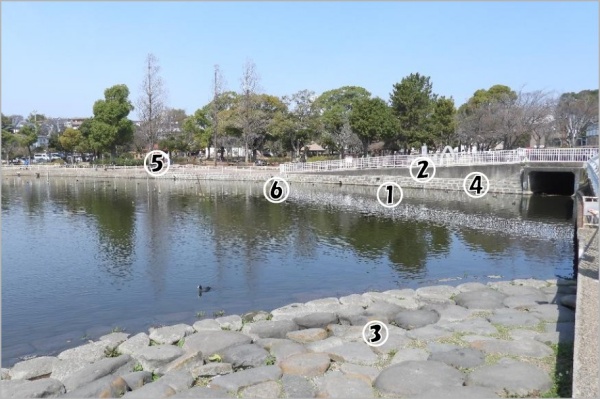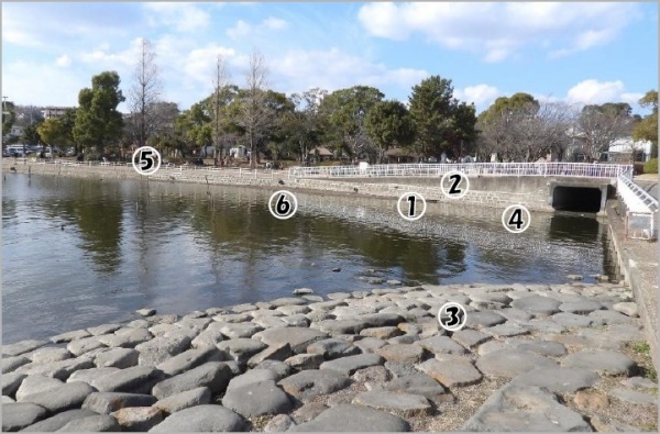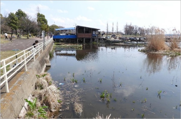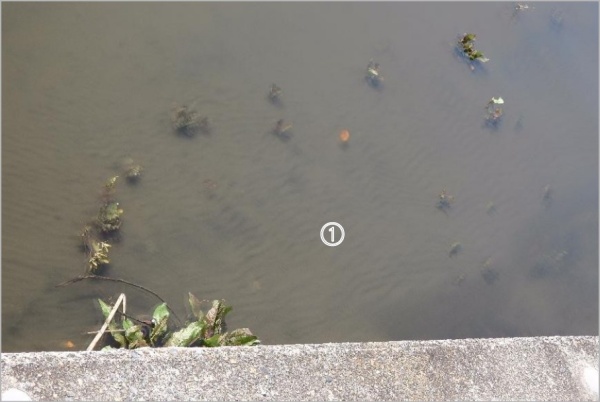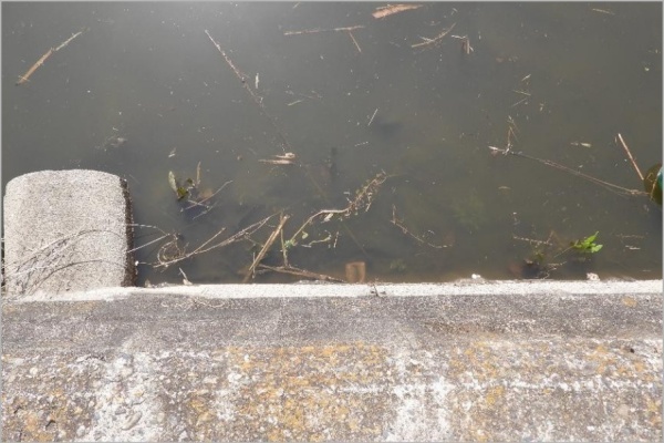 手賀排水機場 に流入する 北側の河川六軒 川の 1つ 目に架かる 六軒 橋の下流側 には ナガエ は全く見当たらない。