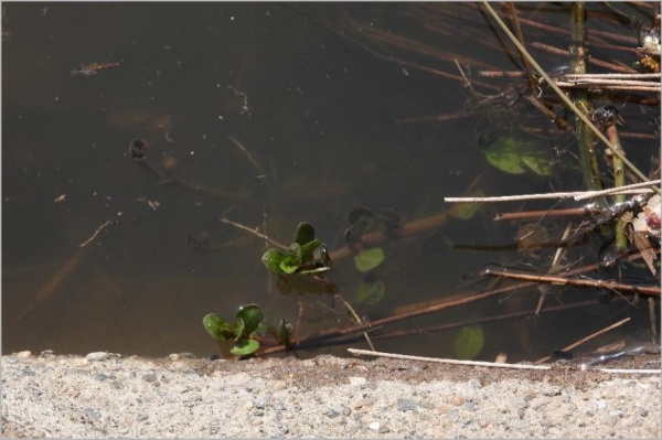 ナガエ・オオバナの駆除作業が行われた1ヵ月後の状況。水面を見た範囲ではナガエ等の繁茂は無かったが、護岸、植物帯の傍でナガエ・オオバナが所々で発芽していた。
