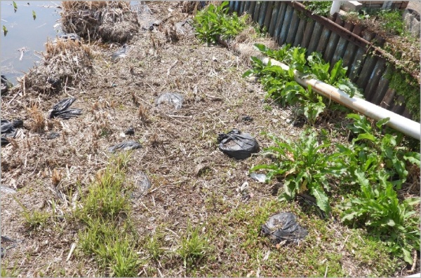 機場の南 東 側 に流れ込 む 水路には、多くのナガエの切れ端があった。機場から逆流したか?