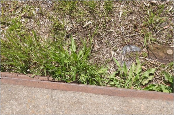 自動販売機脇で前月見られたナガエは除去され、別の植物が芽生えていた。
