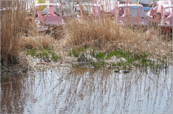 枯れたヨシやマコモの前に新しいマコモが芽吹きはじまった。ナガエ・オオバナは無かった。
