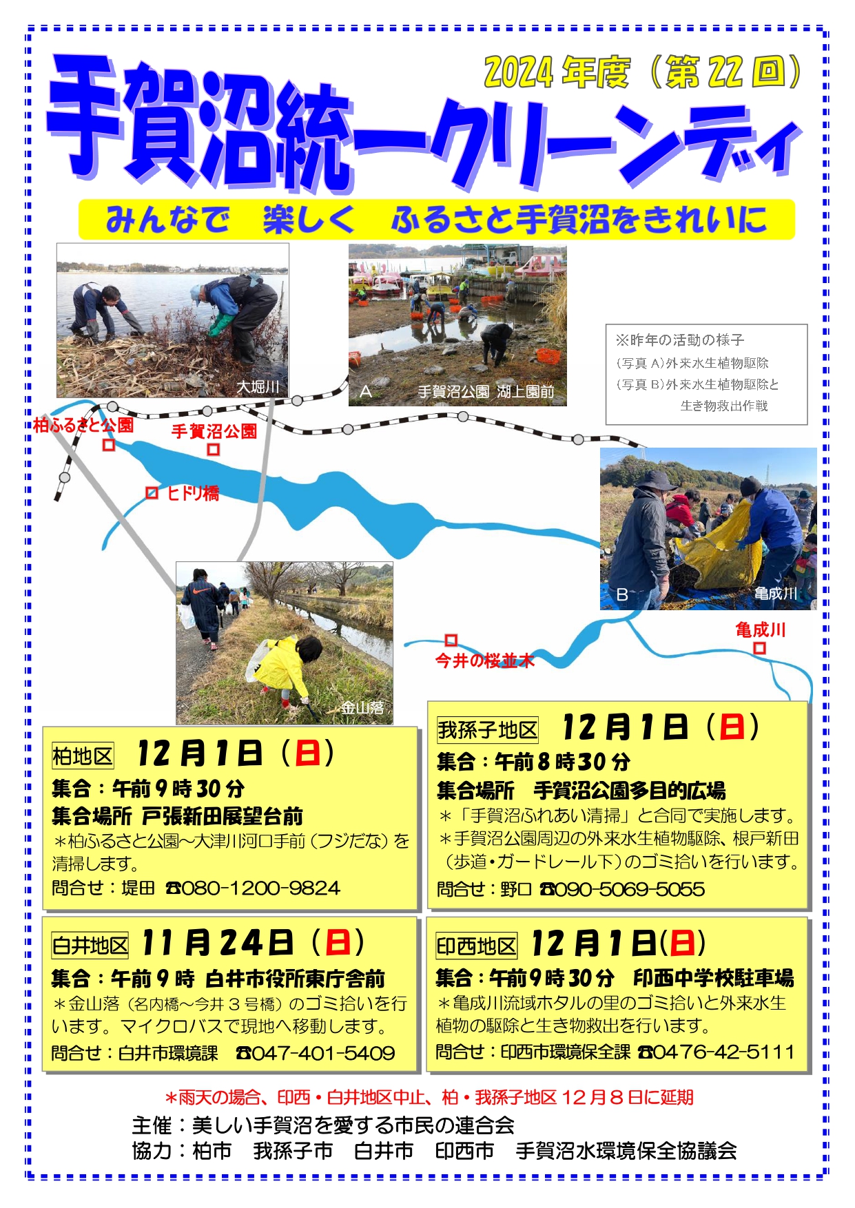 第22回手賀沼統一クリーンデイは柏地区の2箇所(柏ふるさと公園・大津川 河口手前)、我孫子地区、印西地区(亀成川流域)、白井地区の4箇所で開催いたします。