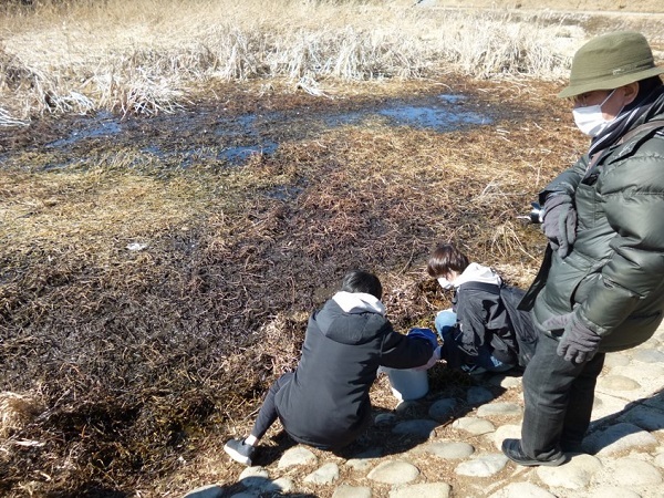 学生さんたちは、芽が出たオオバナを集めてビニール袋に入れ 、実験室に持ち帰りました 。実験